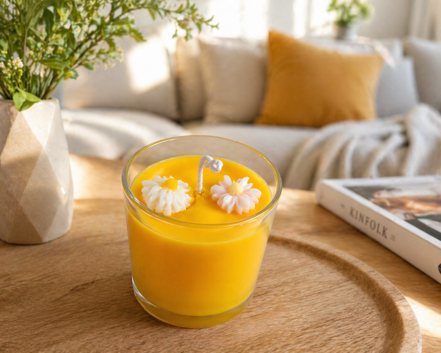 Sweet Flame – Χειροποίητο Αρωματικό Κερί Σόγιας “Fresh Mandarin” με Διακοσμητικά Λουλούδια με δροσερό άρωμα πορτοκαλιού που γεμίζει τον χώρο με φρεσκάδα και θετική ενέργεια.